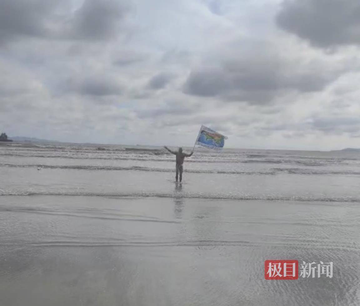 “东海水好咸啊!”鲍政斌一手举旗,一手挥臂击水,在大海里畅游了一小时,才依依不舍地上了岸。“之前许多海岸线都无法游,这是我从崇明岛出发半个月来,游得最尽兴的一次。”他感叹道。